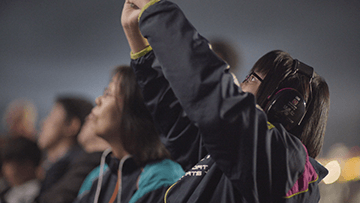 Hapbeatは音の波形を振動に変える装置で、首からかける小さな装置から繰り出される小気味よい振動は、ライブハウスにいるような臨場感を与えてくれます。視聴覚障がいの方々に、振動で花火を楽しんでもらえるのではないか、という試みとして2つの花火プログラムでHapbeatを使用しました。