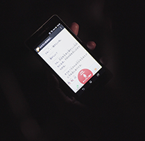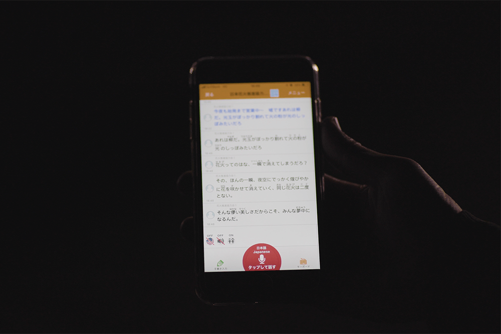 「聞こえ」のストレスをさらに低減させるために、音声を文字に変換するアプリ「UDトーク」を使用して、場内アナウンスをリアルタイムのテキスト情報として、スマートフォンに配信。花火朗読劇「命日(いのちび)」のセリフもテキスト情報として表示させ、聴覚障がいの方々にも花火と物語を楽しんでいただきました
