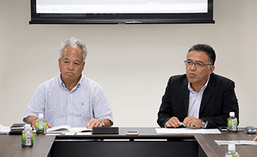 - 日本花火推進協力会 小勝会長(左)と司会進行の小松理事(右)
