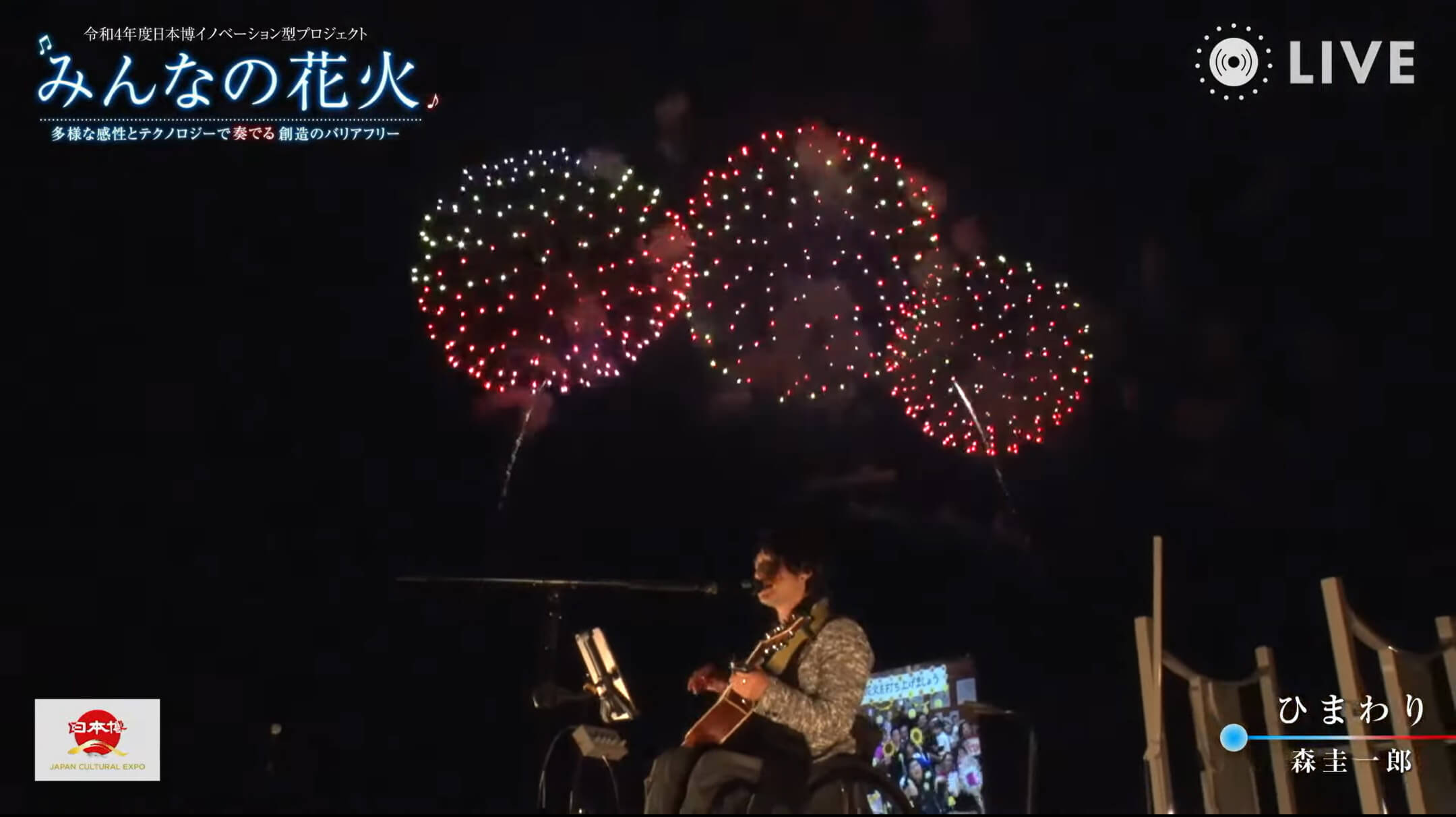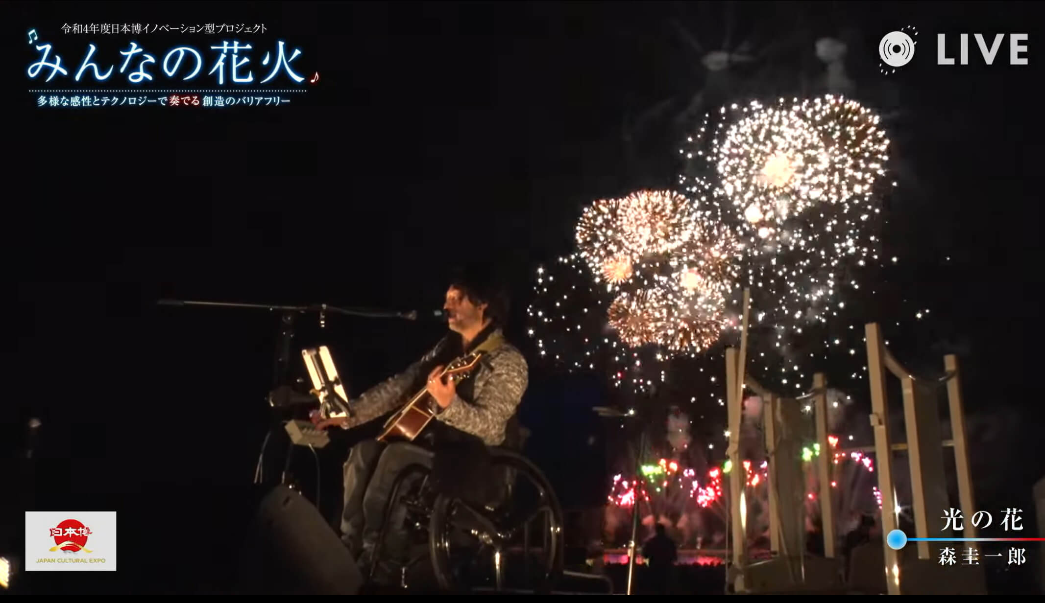 愛知県蒲郡市の花火甲子園では花火×音楽を多様性ある次元に進める・障害を持った音楽家の才能の披露の花火打揚げのため、車いすミュージシャンの森圭一郎氏に本企画のために楽曲制作を行い、その曲をもとに花火のプログラムを作り上げました。